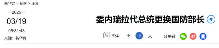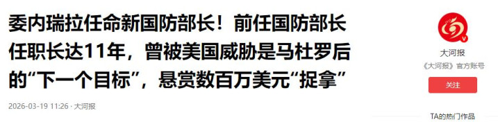 大河报:委内瑞拉任命新国防部长!前任国防部长任职长达11年,曾被美国威胁是马杜罗后的“下一个目标”,悬赏数百万美元“捉拿”