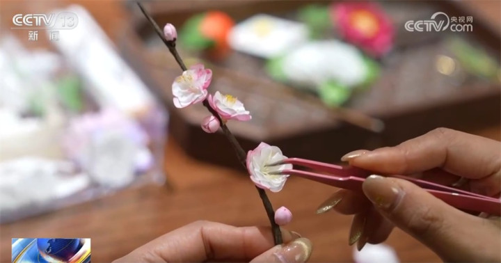 这支梅花就是用扬州通草花制作技艺做出的仿真花。扬州通草花制作技艺是江苏省非物质文化遗产代表性项目,匠人们以通草的茎髓为原材料,经剪瓣、揉搓、上色、捻枝、粘贴等多道工序,通过手工捏制,可仿制出梅花、丁香、琼花、菊花、牡丹等各类花卉,其花瓣薄如蝉翼,形态栩栩如生,因其经久不谢被誉为“永不凋谢的艺术之花”。
