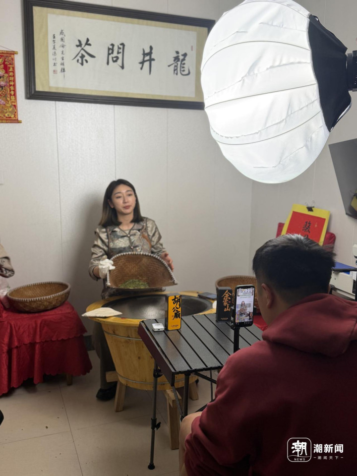 在龙井村戚美琴茶叶店里,龙井村90后新茶人付晓婷正在给直播间的粉丝上新链接,随着“五四三二一”的喊声,2斤干茶预定链接全部被网友抢空。